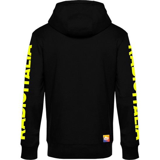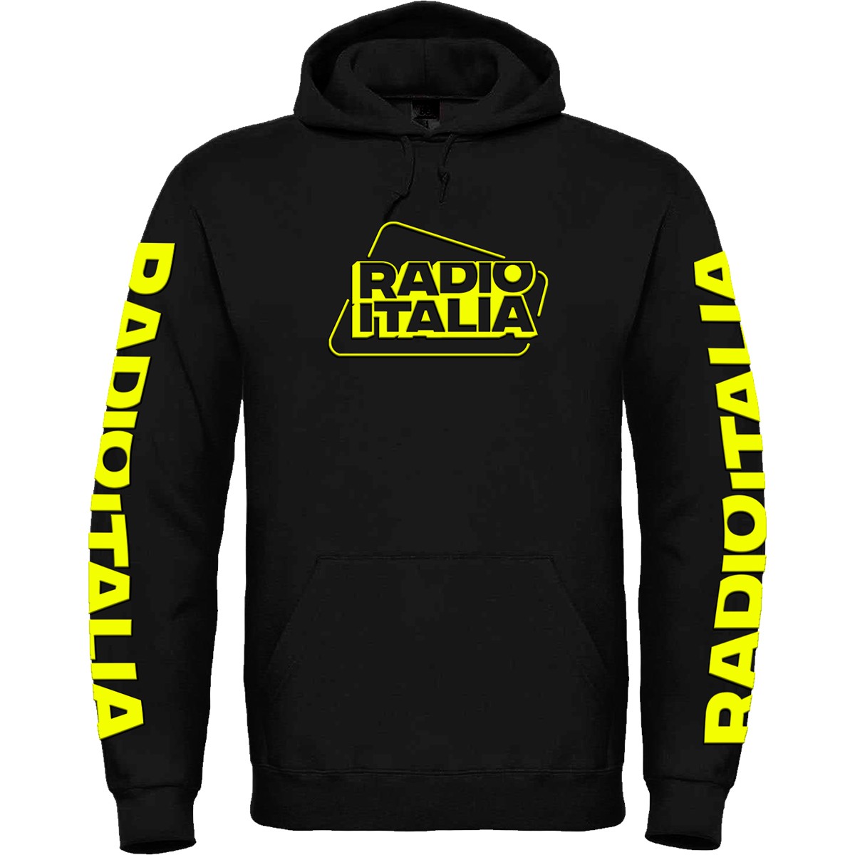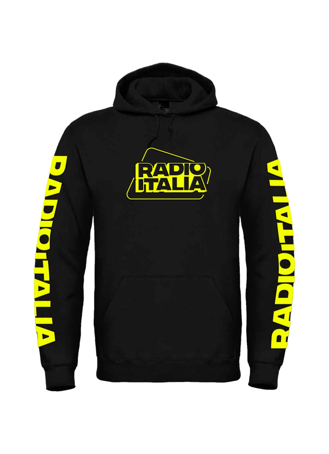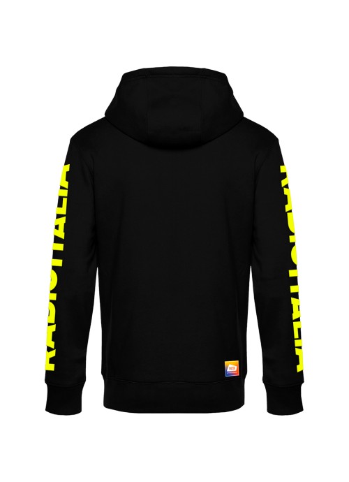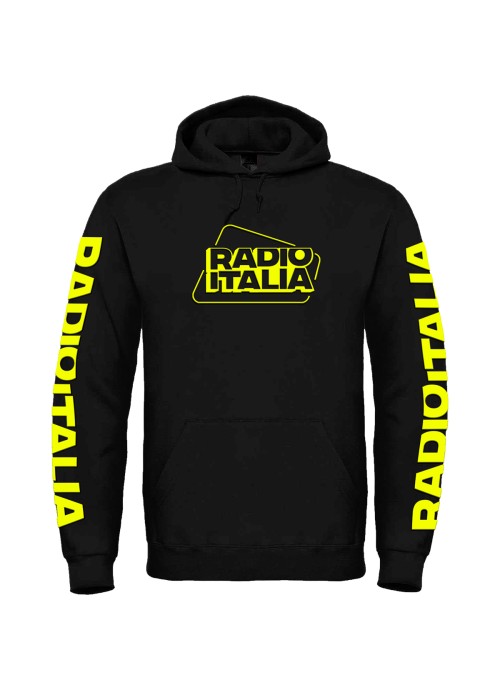 Felpata internamente, maniche setin, cordini in tono. Materiale 100% cotone, grammatura 280 gr. Personalizzazione fronte con logo Radio italia in colore giallo fluo, e scritta RADIO ITALIA sulle maniche in colore giallo fluo.