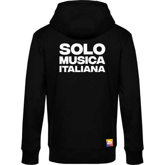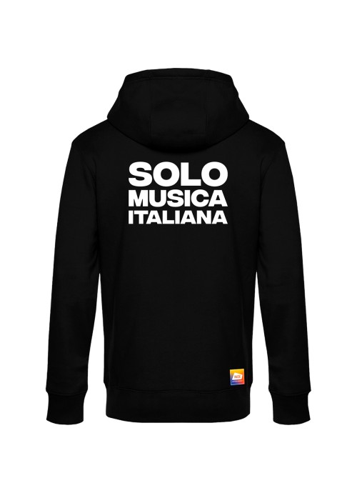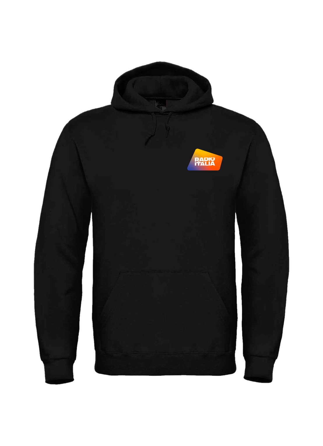 Felpata internamente, maniche setin, cordini in tono. Materiale 100% cotone, grammatura 280 gr. Personalizzazione fronte con logo Radio italia e scritta sul retro.