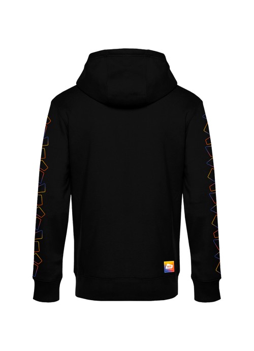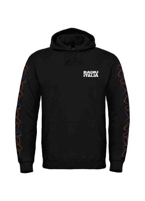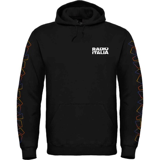 Felpata internamente, maniche setin, cordini in tono. Materiale 100% cotone, grammatura 280 gr. Personalizzazione fronte con logo Radio italia e texture su maniche e spalle.