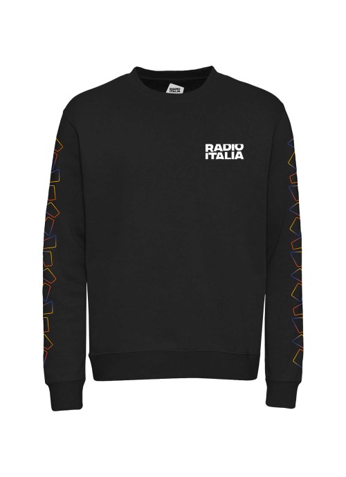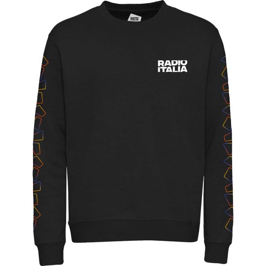 Collo, polsini e orlo inferiore in costina, rinforzo sul colletto, maniche set-in, struttura con cuciture laterali. Materiale 70% cotone, 30% poliestere. Grammatura 280 gr. Personalizzazione fronte con logo Radio italia e texture su maniche e spalle.