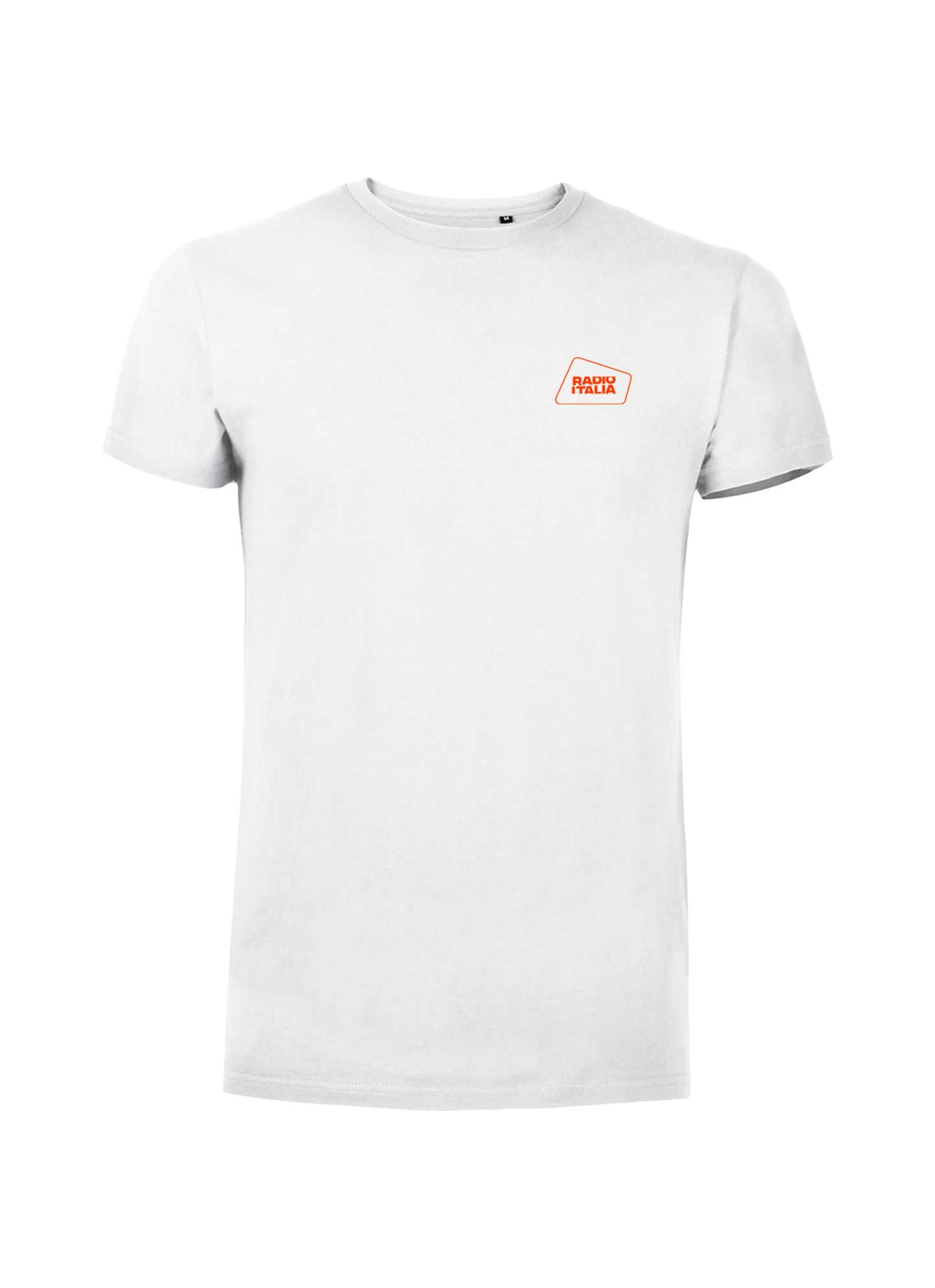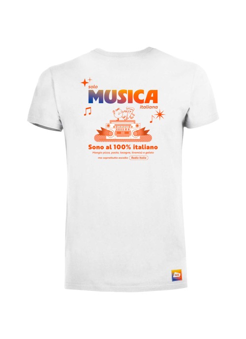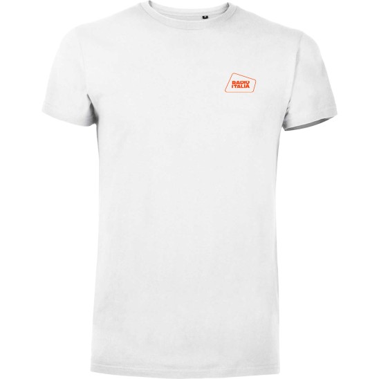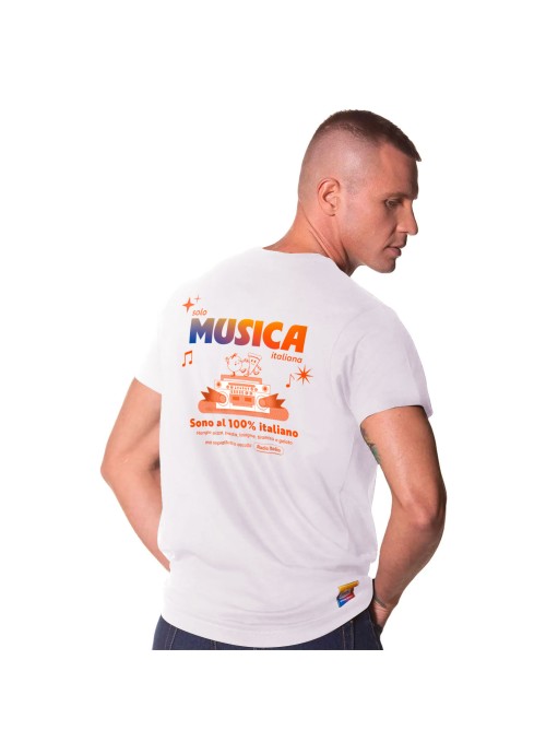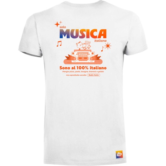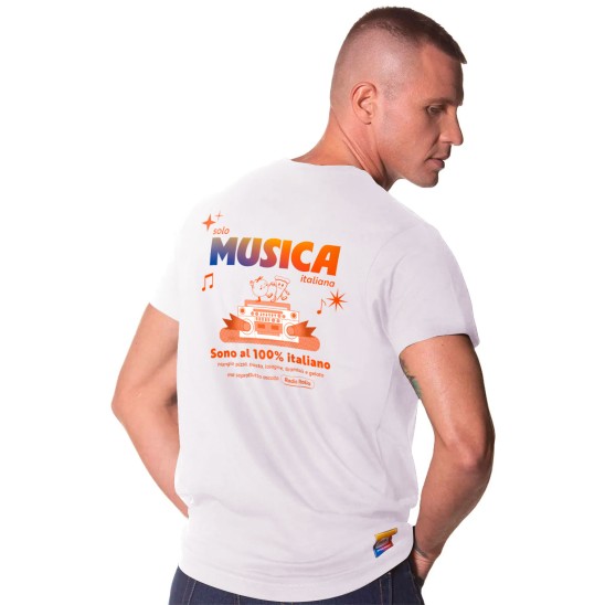 Struttura con busto tubolare, colletto doppio strato a costine con cuciture doppie, nastro di rinforzo al collo. Materiale 100% cotone biologico. Grammatura 150 gr. Modello unisex. Personalizzazione fronte con logo Radio Italia e retro grafica MUSICA.