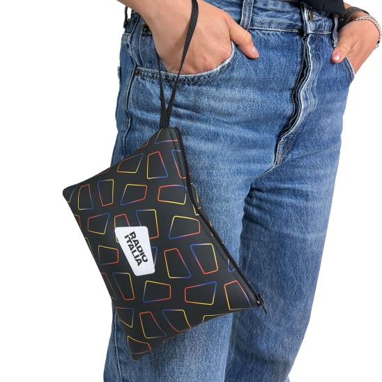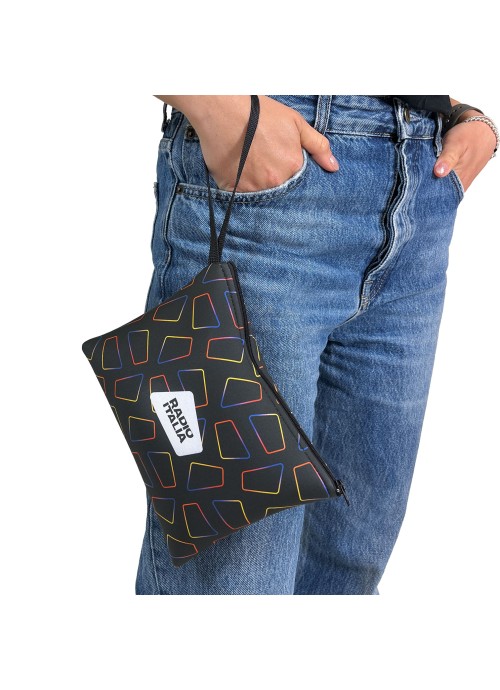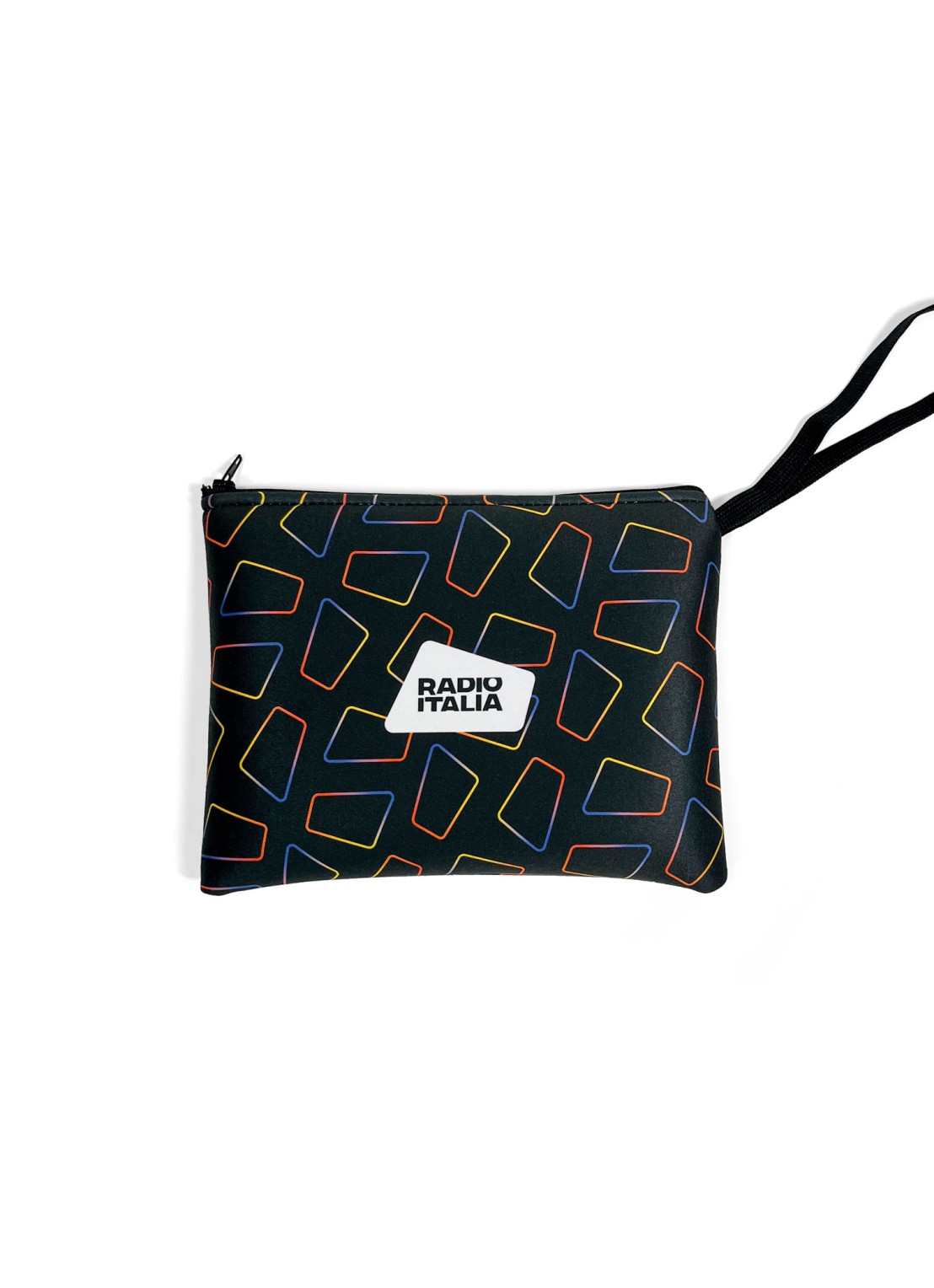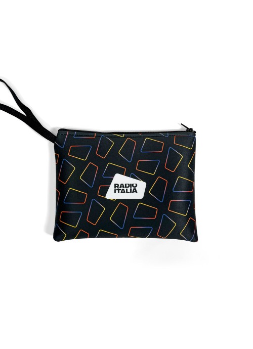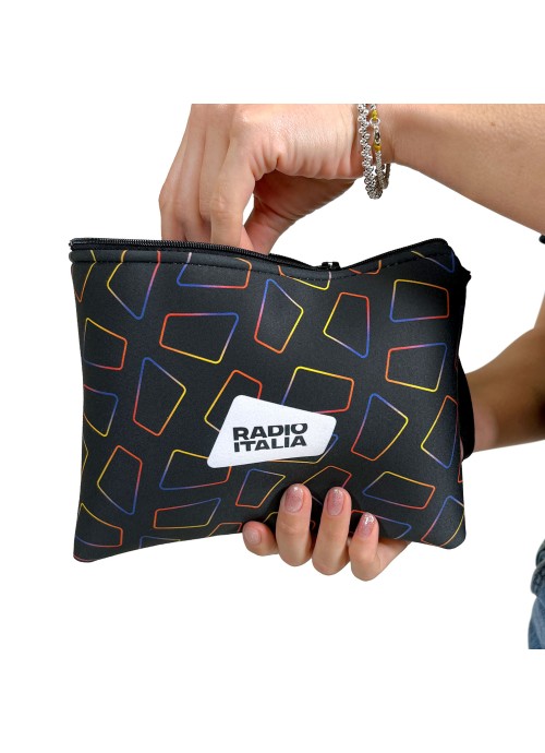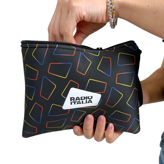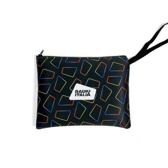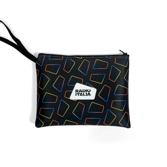 Dimensione 22 x 16 cm, con nastrino per indossarla al polso. Personalizzazione all over a fantasia Radio Italia