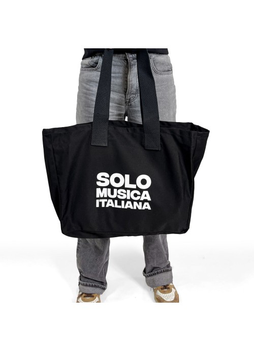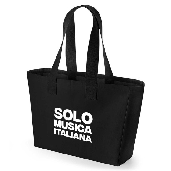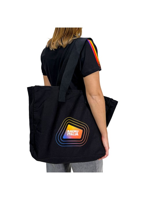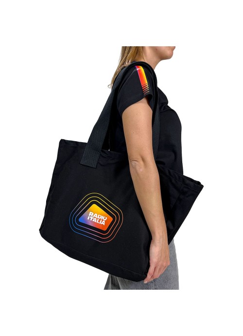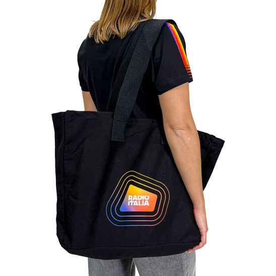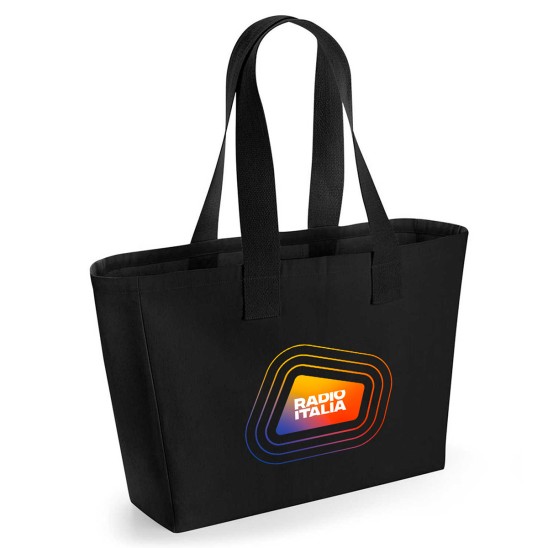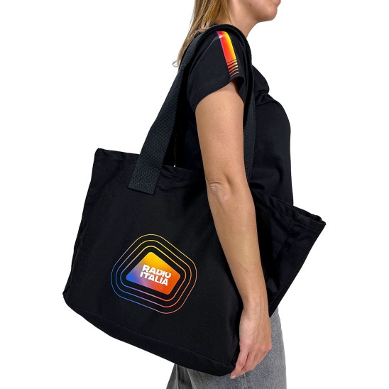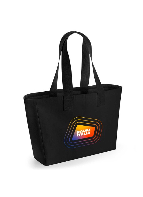 Lunghezza manici: 83 cm, dimensioni: 43x 34,5x 13,5 cm, capacità: 24 lt. materiale 100% cotone canvas. Colore nero, personalizzazione su due lati con logo e scritta stampati.