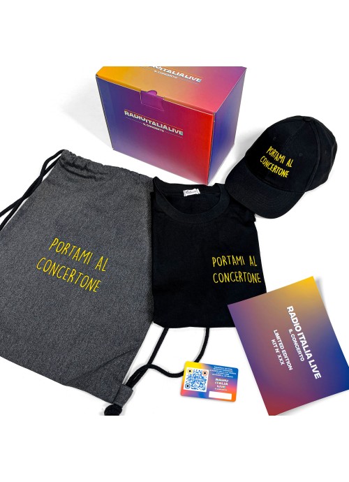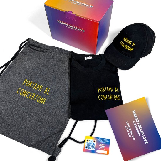 Venerdì 15 Maggio 2026 in piazza Duomo a Milano torna Radio Italia Live Il Concerto. Per l'occasione Radio Italia ha realizzato un Kit in edizione limitata: cappellino, t-shirt e sacca personalizzate. Acquistando il Kit riceverai in regalo una "card unica" che ti permetterà di accedere all'esclusiva Area Vip Ring per assistere al concerto da vero protagonista. "Nel momento in cui riceverai il kit, troverai all’interno una card con un QR code. Inquadralo e registrati con i dati della persona che parteciperà al concerto entro e non oltre mercoledì 6 maggio. Sarà poi necessario ritirare l'accredito solamente nelle giornate di mercoledì 13 e giovedì 14 maggio, in Piazza Duomo a Milano, secondo le istruzioni che verranno fornite direttamente all'indirizzo indicato in fase di registrazione.
